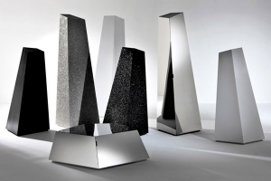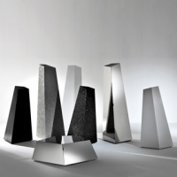 Totem-like furniture, resembling essential architectures, with a major and sculptural impact arousing a new and mysterious scenario. Their slanted poses create an unexpected atmosphere, a slight disorientation; when juxtaposed, similar to metaphysical objects they produce an effect of suspension.